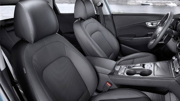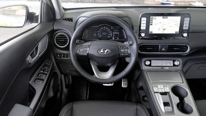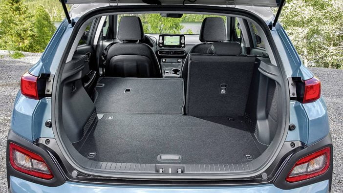 De 453 kilo zware lithium/ion polymeer batterijen liggen onder de bodemplaat, zodat er geen interieurruimte verloren gaat. De bagageruimte is 373 liter groot (met de achterbankleuning neergeklapt 1.114 liter), al houd je 332 liter over als je de laadkabel mee vervoert. In de conventioneel aangedreven Kona kan er voor 361 liter aan spullen worden meegenomen. Ook het interieur van de Kona Electric verschilt van de reguliere uitvoeringen. Zo heeft de middenconsole een andere indeling gekregen met onderaan een extra opbergvak. Op het 7,0 inch grote Supervision display is alle belangrijke informatie (accustatus, snelheid, rij modus, enzovoort) af te lezen. Die gegevens kunnen ook op de voorruit worden geprojecteerd. De Premium uitvoering is uitgerust met 8-voudig elektrisch verstelbare voorstoelen (inclusief ventilatie en verwarming). Een verwarmbaar stuurwiel is optioneel. Standaard zijn een inductielader voor de telefoon, een geluidsinstallatie van Krell met 8 luidsprekers en adaptieve cruisecontrole met filefunctie.