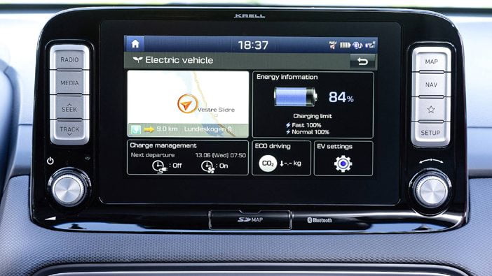 Hyundai levert voor de Kona Electric een Wallbox thuis laadpakket voor 1.699 euro. Daarmee kun je de Koreaan opladen in 9 uur en 35 minuten. Inpluggen bij een 100 kW snellader zorgt er voor dat het accupakket in 54 minuten voor 80 procent op te laden is. Om te voorkomen dat teveel stroom gebruikt wordt voor de verwarming van de auto is de elektrische Kona voorzien van een warmtepomp. Ook komt de auto met een automatische verwarm/koelsysteem voor de accu, hetgeen de levensduur van de batterijen verlengt. Tevens laat dit de batterijen onder extreme omstandigheden beter presteren.