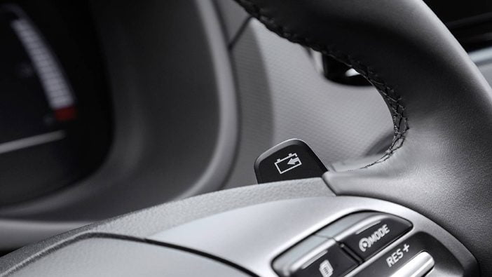 Via de schakelpeddels achter het stuur kan je zoals gezegd bepalen in welke mate jij de Kona Electric wilt laten afremmen zonder het pedaal te gebruiken. Er kan daarbij gekozen worden voor een mate van energierecuperatie die zo fel is dat je de Hyundai er helemaal mee tot stilstand kan brengen; als je de linkerpeddel langdurig activeert. Voor tijdens het rijden zijn er 3 (andere) settings om mee te vertragen. Daar moet je vanzelfsprekend in het begin aan wennen en vaak is de remdosis dan wat te hard, maar na even oefenen begon mijn luie linkervoet het wel te waarderen. Toch geef ik de voorrkeur aan de methode van BMW, waarbij de inbreng van de motorrem via het gaspedaal wordt geregeld.