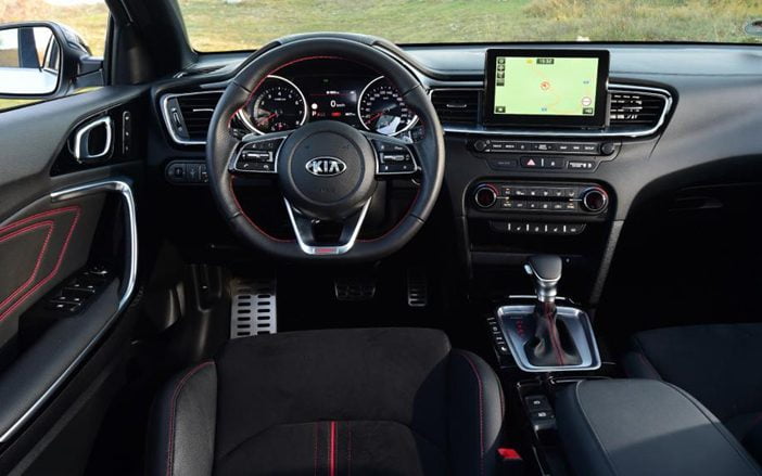 Kia heeft niet bezuinigd op de kwaliteit van het dashboardplastic. De geteste GT uitvoering is bovendien voorzien van sportstoelen met rood stikselwerk.