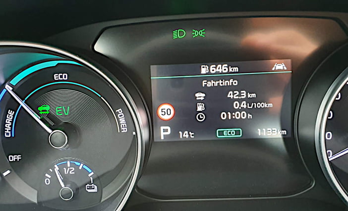 Volgens Kia kan er 60 kilometer volledig elektrisch gereden worden met deze stekker hybride combi. Was dat tijdens de test in de praktijk haalbaar? Bijna, maar je moet daarvoor wel wat doen en vooral heel veel laten. Geen kickdown met het gaspedaal bewerkstellingen. Geen tussensprints maken. Altijd de stroomverbruik meter in het instrumentarium in de gaten houden zodat je weet wat de Ceed SW Plug-in Hybrid aan het doen is. Bergafwaarts moet je maximaal voor remenergie recuperatie gaan en bergop het gaspedaal hooguit strelen met je voet: de benzinemotor mag in geen geval wakker worden. Indien jij je aan deze regels houdt, dan is 58 kilometer emissievrij rijden mogelijk, zo bleek tijdens de test. Maar die actieradius wordt midscheeps getorpedeerd als je besluit om even (snel) in te halen.