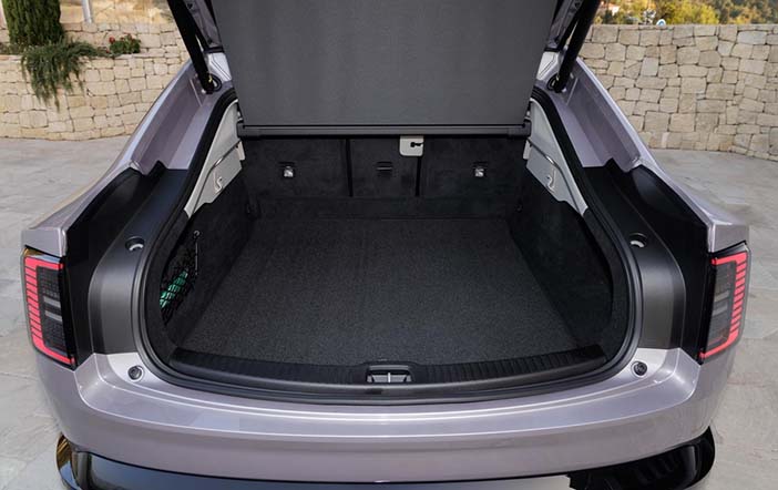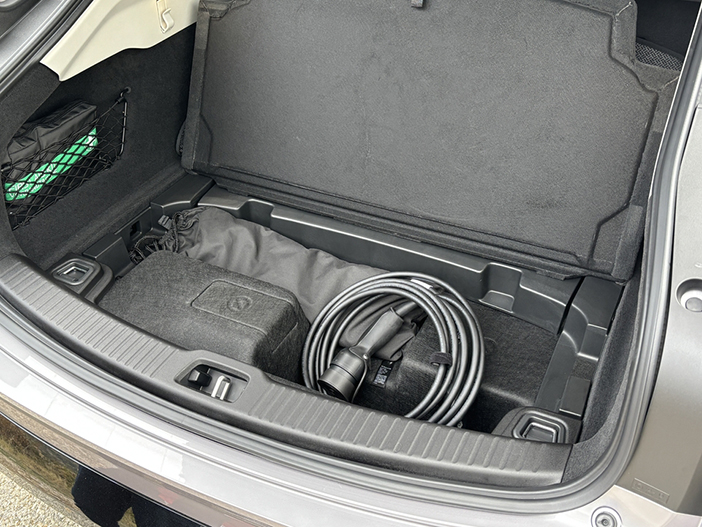 Met een inhoud van 424 liter heeft de kofferbak een tegenvallend formaat. Dat er niet meer plek is voor bagage komt door de nogal hoge vloer. Gelukkig bevindt zich daarin nog een opbergruimte voor laadkabels. Die kan men eventueel ook voorin kwijt, want daar is er nog een frunk. Weliswaar slechts 33 liter groot, maar toch. De achterbank kan in aparte delen worden neergeklapt. Dat is handig als er lange voorwerpen vervoerd moeten worden. En het vergroot de totale laadcapaciteit tot 1.427 liter.