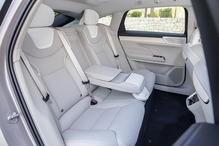 Alle inzittenden kunnen genieten van het (optionele) elektro-chrome panorama dak met een regelbare transparantie. Zij worden ook in de watten gelegd met 25 luidsprekers die horen bij het audiosysteem van Bowers & Wilkins (optie). Daarmee verander je de ES90 in een kleine concertzaal. Ik heb zelden in een testauto zo’n fraaie klank gehoord. Een speciale vermelding verdient de Abbey Roads Mode, die de akoestiek simuleert van de fameuze opnamestudio waar sterren zoals Pink Floyd, Oasis en natuurlijk The Beatles kind aan huis waren. Genieten kan je bij momenten ook van de stilte want dankzij het dikke glas van de ruiten beschikt de Volvo over een uitzonderlijk goed geïsoleerd interieur. Dat is extra knap want de zijramen beschikken niet over een frame.