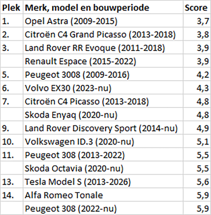 De lijst wordt aangevoerd door een Opel. Deze uitkomst is illustratief voor de algehele aftakeling van dit merk. Tot ver in de jaren-80 van de vorige eeuw wist Opel haar reclameslogan ‘Der Zuverlässige’ zondermeer waar te maken. Maar naarmate de boekhouders van moederbedrijf General Motors meer greep kregen op het merk, verloor Opel steeds meer glans. Is Opel sinds de overname door Peugeot SA in kwalitatief opzicht in rustiger vaatwater beland? Autointernationaal.nl durft daar geen vergif op in te nemen, gezien het feit dat de merken Citroën (de C4 (Grand) Picasso van 2013-2018 was een ‘lemon’) en Peugeot met meerdere modellen in de top-15 vertegenwoordigd zijn.
