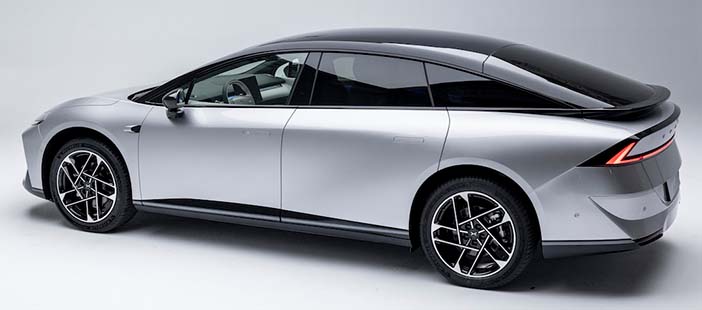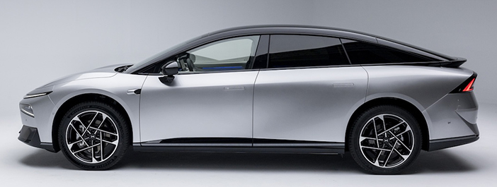 De Xpeng P7+ is bijna 5,1 meter lange Chinese elegantie. De gewelfde motorkap en de spoiler onder de achterruit zorgen voor een sportieve touch. De koplampen zijn zeer smal en de lichtblokken aan de achterkant zorgen voor wat kleur tussen de lichtgrijze en zwarte lak. Al met al kan worden gesproken van een geslaagd design.