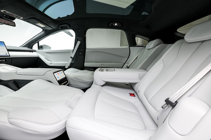 Met zijn materiaalkeuze en afwerkingskwaliteit maakt Xpeng wél indruk. Wat dit betreft hebben de Duitse premium merken geen meerwaarde. Het interieur is dankzij de 3 meter lange wielbasis bijzonder ruim. De rugleuningen van de voorstoelen kunnen helemaal plat worden gelegd, zodat men in de P7+ een dutje kan doen. Voor de passagiers achterin, die ook verstelbare zetels hebben, is er een scherm dat toegang tot heel wat infotainment functies biedt.