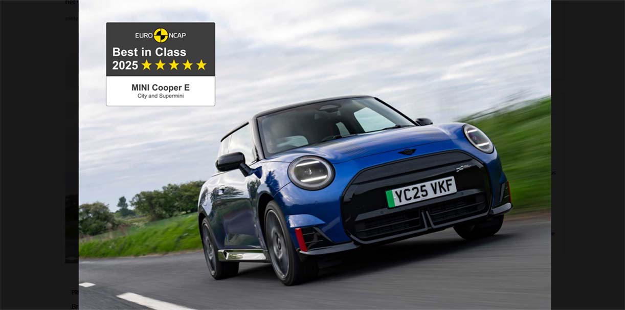 De volledig elektrische Mini Cooper, die in maart 2025 al werd bekroond met 5 sterren in de Euro NCAP crashtests, heeft opnieuw erkenning ontvangen van het gerenommeerde Euro NCAP-instituut: de titel “Best in Class voor Veiligste Stadsauto & Supermini van het Jaar 2025”.