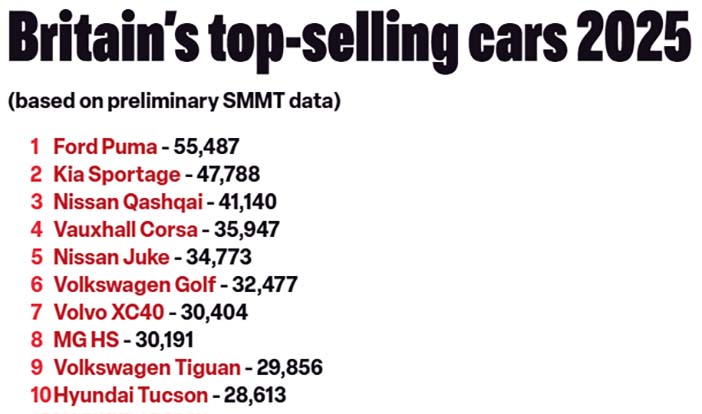 +++ The FORD PUMA was the United Kingdom’s best-selling car in 2025, according to new data released by the SMMT (Society of Motor Manufacturers and Traders), making it 3 years on the trot that the small cross-over has topped the sales chart. In total, 55.487 new Ford Pumas were sold last year; up from 48.340 in 2024. It certainly will have helped that an all-electric version of the Ford (the Puma Gen-E) arrived in showrooms last year, as demand for EVs continued to rise in 2025. The Kia Sportage had a good innings, but came in second to the Ford once again, with 47.788 sold. Similarly, the British-built Nissan Qashqai took third place in the rankings again, with 41.140 examples finding new homes. Meanwhile, the Vauxhall Corsa, which failed to crack the top 10 best-sellers list in 2024, made quite the comeback by claiming 4th place, with 35.497 units leaving showrooms last year. The Nissan Juke wasn’t far behind in fifth, with 34.773 sold. The Tesla Model Y was the fifth most popular car in the UK in 2024, however, it didn’t make it onto the top 10 list this time around as sales dropped by more than 8.500 units year-on-year. Nevertheless, with 24.298 examples sold, it remained the most popular EV in the UK, followed by the Tesla Model 3 in second and the Audi Q4 e-Tron in third. In total, 2.020.373 new cars were registered in 2025. This is the first time sales reached such levels since the Covid-19 pandemic hit in 2019, and represents a 3.5 percent increase on the year before. Some 1.19 million cars (or roughly 6 out of every 10) went to fleets, while 779.524 were private sales, which was a 4.5 per cent increase. Despite sales of petrol cars dropping by 8 percent last year, it remained the preferred choice among Brits, accounting for more than 46 percent of the total market share. Electric cars were second (23.4 percent), followed by full hybrids (13.9 percent), plug-in hybrids (11.1 percent) and finally diesels (5.1 percent). Unsurprisingly, the biggest decline was in sales of diesels, which dropped by nearly 16 percent, whereas sales of plug-in hybrids shot up by 34.7 per cent compared with 2024. Meanwhile, 473,340 new electric cars were registered in 2025. That’s more than in the whole of 2021 and 2022 combined, and means they accounted for almost one-in-four cars sold in the UK last year, potentially making it the second biggest market for EVs in Europe. That said, sales failed to reach the 28 percent target set by the British government as part of its ZEV Mandate.