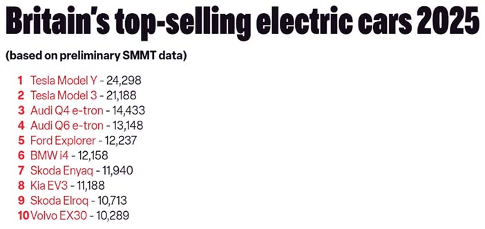 +++ The TESLA MODEL Y was the best-selling electric car in the United Kingdom in 2025, with its saloon sibling the Model 3 not far behind. The Tesla duo took first and second spot in the EV sales charts for the year released by the SMMT (Society of Motor Manufacturers and Traders). 473.340 new electric cars were registered in the UK last year; 23.9 percent more than in 2024 and more than were sold in 2021 and 2022 combined. 24.298 of those were Model Ys while 21.188 were Model 3s, meaning Tesla alone accounted for almost 10 percent of all the EVs that Brits purchased in 2025. It’s worth noting that nearly 33.000 Model Ys were sold there in 2024, which made it the fifth most popular car overall in the UK and put it ahead of the likes of the Volkswagen Golf, Hyundai Tucson and Volvo XC40. With roughly 8.500 fewer examples sold in 2025, the electric SUV failed to make it onto the top 10 best sellers list this time around. And despite shifting more Model 3s in 2025 than it did the year before, Tesla’s total sales dropped by nearly 10 percent year-on-year. Elsewhere, the Audi Q4 e-Tron and Q6 e-Tron claimed the third and fourth spots in the EV sales chart, with 14.433 and 13.148 examples sold, respectively. Rounding out the top five was the Ford Explorer, 12.237 examples of which left showrooms, meanwhile the Skoda Elroq, claimed 9th place. Interestingly, the Elroq, Q4 e-Tron and Explorer are all based on Volkswagen’s MEB platform, however none of VW’s own electric models (of which there are 7) were among the top 10 best-selling EVs last year. That’s particularly surprising when you consider Volkswagen remains the most popular car brand in the UK in terms of total sales. Despite EVs accounting for practically 1 in every 4 new cars sold last year (23.4 percent of the total market share, to be precise) and there now being more than 160 zero-emissions for motorists to choose from, as a whole sales still fell short of the 28 percent target set by the British government under its ZEV Mandate. That target has risen to 33 percent for 2026. The introduction of the new Electric Car Grant (ECG) in July 2025 will certainly have helped boost the appeal of EVs among buyers. However, according to the SMMT only about a quarter of all electric cars are eligible for a Government discount and it says manufacturers continue to subsidise the sales of EVs themselves to try and meet the Government’s targets. The SMMT claims brands forked out roughly 6.5 billion euro in discounts last year alone, which equates to 12.500 euro per EV sold. “This level of subsidisation is clearly unsustainable”, the organisation reiterated. Mike Hawes, chief executive of SMMT, referred to the discounting as the “cost of compliance” for the ZEV mandate, and pointed out to us that the fine a brand faces for every EV it misses the Government’s target by is 14.000 eur. He also highlighted that the gap between the number of EVs sold and the ZEV target was 4.6 percent last year, up from 2.4 percent in 2024. The British government did launch a consultation into the ZEV Mandate in late 2024, but has yet to complete a review of the policy. “We think that the review needs to be brought forward and definitely completed in 2026 because you need to have an assessment about whether this is delivering what it needs to deliver, and the wider impact that will have on the industry”. The SMMT has also said the announcement of a new ‘eVED’ tax on EVs (more commonly known as pay-per-mile) has sent “a confusing message to consumers, undermining rather than encouraging market confidence”.