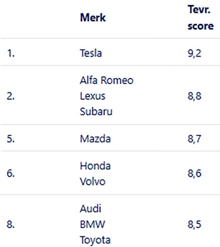 Het blijkt dat Tesla de meest tevreden klanten heeft want dit merk scoort qua tevredenheid een 9,2. Dat is niet verrassend want eerder heb je al kunnen lezen dat de Tesla Model 3 de meest tevreden eigenaren heeft.