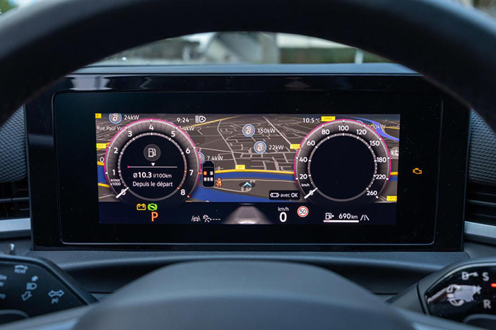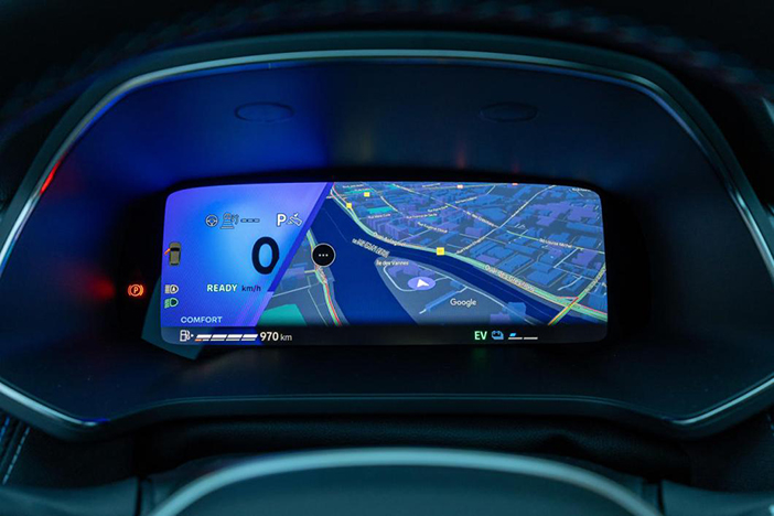 Binnenin is de Esprit Alpine stijl vrij ingetogen. Je moet het doen met een aantrekkelijk, dik stuurwiel, met blauw/witte stiksels en met een paar logo’s. Het draait meer om prestige dan om sportiviteit. Het digitale instrumentenpaneel is modern, aanpasbaar en zeer gemakkelijk af te lezen. Deze kwaliteiten vind je ook terug op het touchscreen, dat wordt bediend via de responsieve en gebruiksvriendelijke Google-interface. Deze biedt met onder andere toegang tot het uitstekende Google Maps navigatiesysteem. En laten we eerlijk zijn, de algehele kwaliteit van het interieur is perfect in deze topuitvoering.