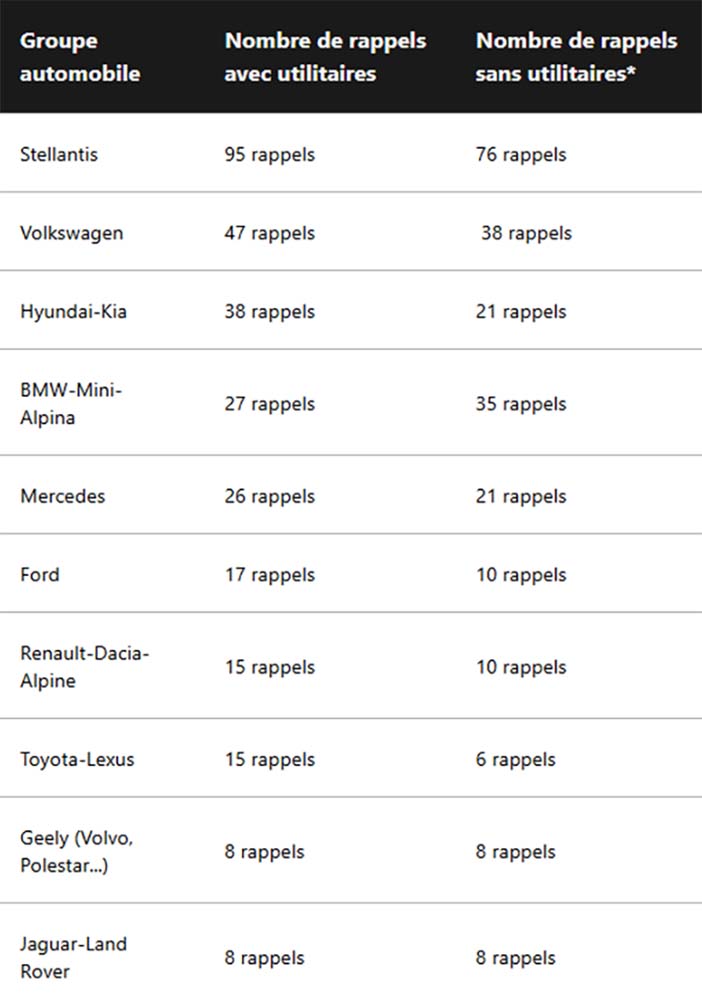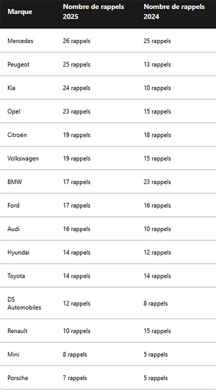 Andere fabrikanten hebben daarentegen de afgelopen 12 maanden talrijke ’traditionele’ terugroepacties uitgevoerd. Dit geldt met name voor Mercedes, dat met een aantal van 26 stuks op de eerste plaats staat. Het Duitse premiummerk behoorde in 2024 ook al tot de merken met de meeste terugroepacties, samen met concurrent BMW, dat afgelopen jaar veel minder getroffen werd. Vlak daarachter vinden we Peugeot met 25 terugroepacties, gevolgd door Kia, dat 24 keer voertuigen terug naar de garage haalde. 2 andere merken van de Stellantis-groep, Opel en Citroën, staan ook in de top 5, hoewel Citroën haar positie deelt met Volkswagen. Overigens kan het feit dat Mercedes in 2025 de fabrikant was met de meeste terugroepacties niet los gezien worden van het feit dat dit merk een zeer uitgebreid modellenaanbod heeft.