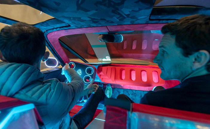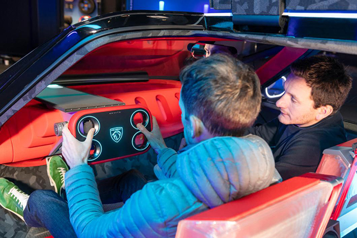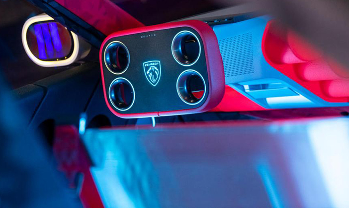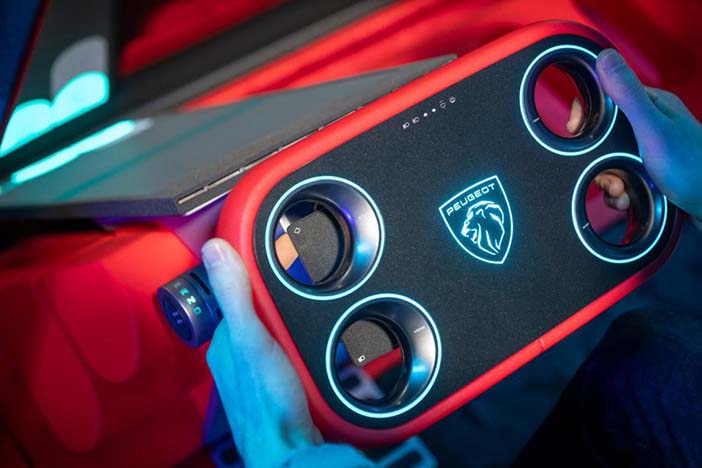 Waar een conventioneel autostuur 3 volledige omwentelingen kan maken, draait het stuur van de Peugeot Polygon slechts 170 graden. Dat is minder dan een halve draai! De richtingaanwijzers, claxon en koplampen zijn met de punt van je wijsvinger te bedienen via schakel paddles achter het stuur. Het laatste voordeel? Perfecte afleesbaarheid van het instrumentenpaneel, dat nu aan de onderkant van de voorruit is geprojecteerd om het dashboard volledig vrij te houden. De vorige Peugeot i-Cockpit kampte met het structurele probleem dat in bepaalde rijposities de bovenkant van het stuur de onderkant van de meters bedekte. Naast de schakel paddles achter het stuurwiel bevinden zich vier bedieningselementen in de uitgeholde cirkels.