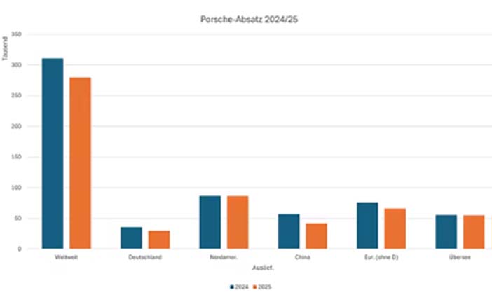 Er zijn in 2025 afgerond 280.000 auto’s afgeleverd door Porsche; 10 procent minder dan het jaar ervoor. In 2023 lag het verkoopaantal zelfs nog hoger, namelijk op 320.221 exemplaren. Het verlies in China is bijzonder pijnlijk, met een daling van 26 procent. Alleen in de Verenigde Staten, waar het merk bijzonder populair is, kan Porsche het niveau van het voorgaande jaar handhaven.