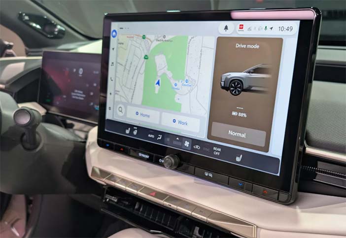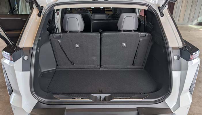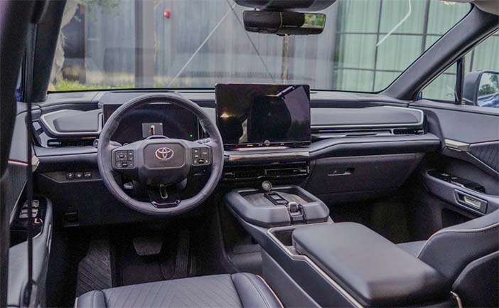 De interieurmaterialen zijn over de hele linie van topkwaliteit. Stoelen bekleed met SofTex zijn standaard, met zachte oppervlakken in het hele interieur en configureerbare sfeerverlichting met 64 unieke kleuropties. Het optionele panoramische glazen dak (het grootste dat Toyota ooit in een auto heeft gemonteerd) laat veel licht binnen en helpt het psychologische gewicht van een volledig elektrisch platform te compenseren.