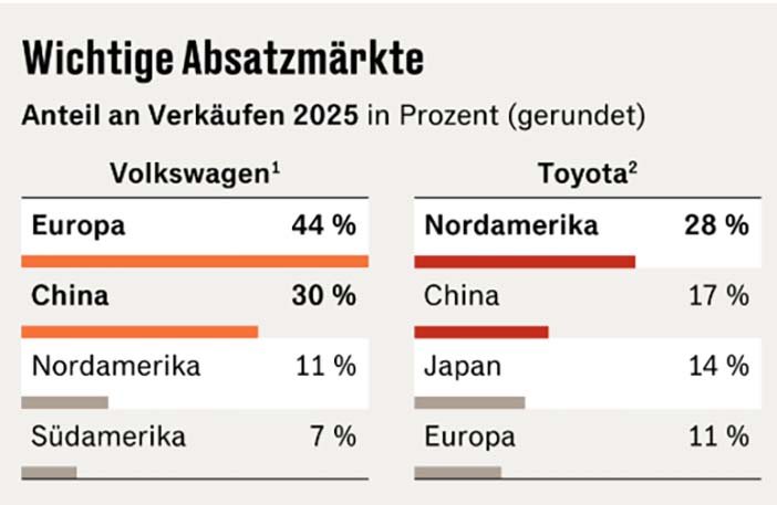 Voor het merk Volkswagen is China de belangrijkste afzetmarkt, goed voor meer dan 30 procent van al haar verkopen. Bij Toyota gaat het daarentegen om minder dan één op de vijf auto’s (zie grafiek). Bovendien heeft Toyota zich lange tijd gericht op hybride modellen in plaats van volledig elektrische voertuigen.