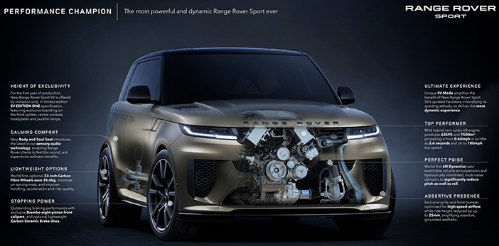 De speciale editie waarmee de 20ste verjaardag gevierd wordt heet Range Rover Sport Twenty Edition en wordt alleen leverbaar als P540 met een 537 pk sterke 4,4 liter V8 van BMW die voorzien is van mild hybride techniek en in P550e plug-in vorm die een systeemvermogen heeft van 550 pk en een 3,0 liter 6 cilinder-in-lijn motor als basisunit heeft.